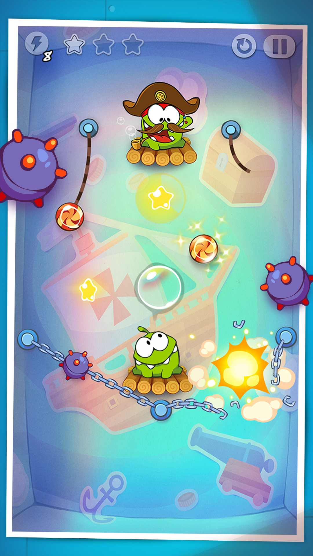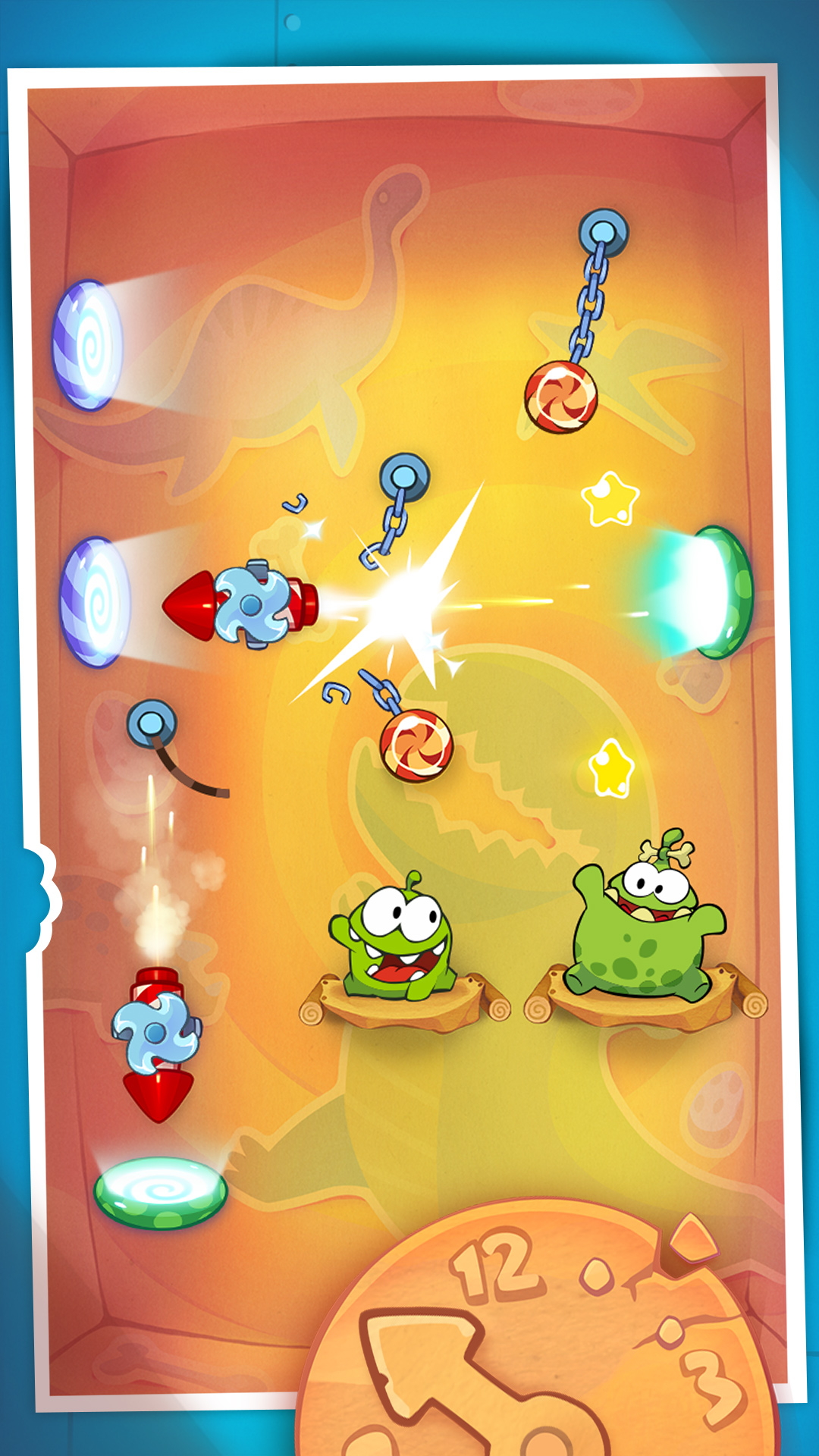 There’s no time to waste! Visit exciting locations including the Middle Ages, the Renaissance, a Pirate Ship, Ancient Egypt, Ancient Greece, the Stone Age, Disco Era, Wild West, Asian Dynasty, Industrial Revolution and the Future. Om Nom’s ancestors are waiting – and they’re getting really hungry for candy!