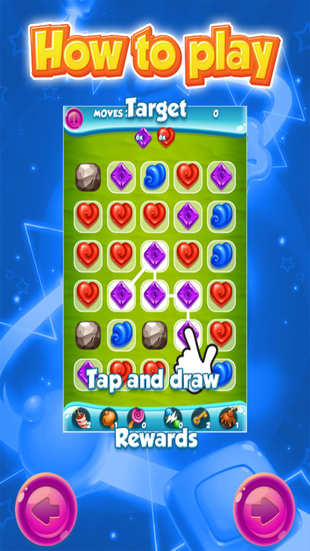 TAP AND DRAW WITH YOUR FINGER. MATCH 3 OR MORE OF THE SAME ITEM.